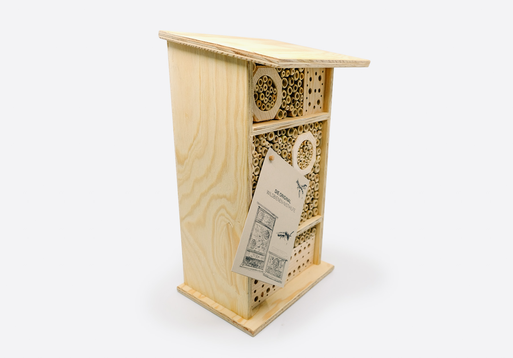 Eine schöne Beobachtungsmöglichkeit, um Wildbienen kennen zu lernen. Die Wildbienen Nisthilfe wurde in enger Zusammenarbeit mit Bioterra und wildbee.ch weiterentwickelt. Weitere Informationen finden Sie im Flyer.