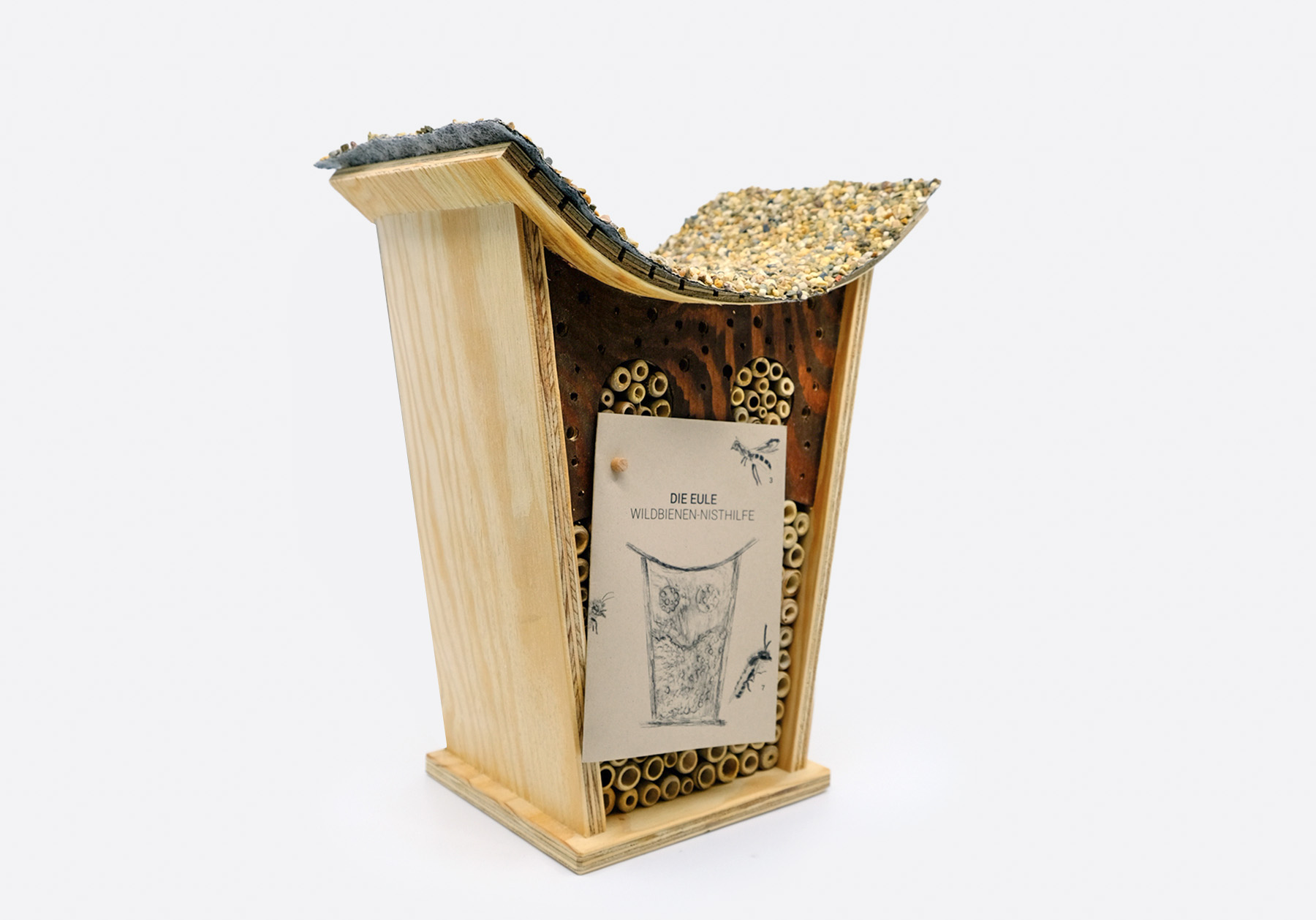Die Mitarbeiter*innen der Holzwerkstatt haben diese tolle Eulen-Nisthilfe entwickelt. Wer weiss vielleicht hält es den einen oder anderen Fressfeind davon ab, den Wildbienen den Garaus zu machen.