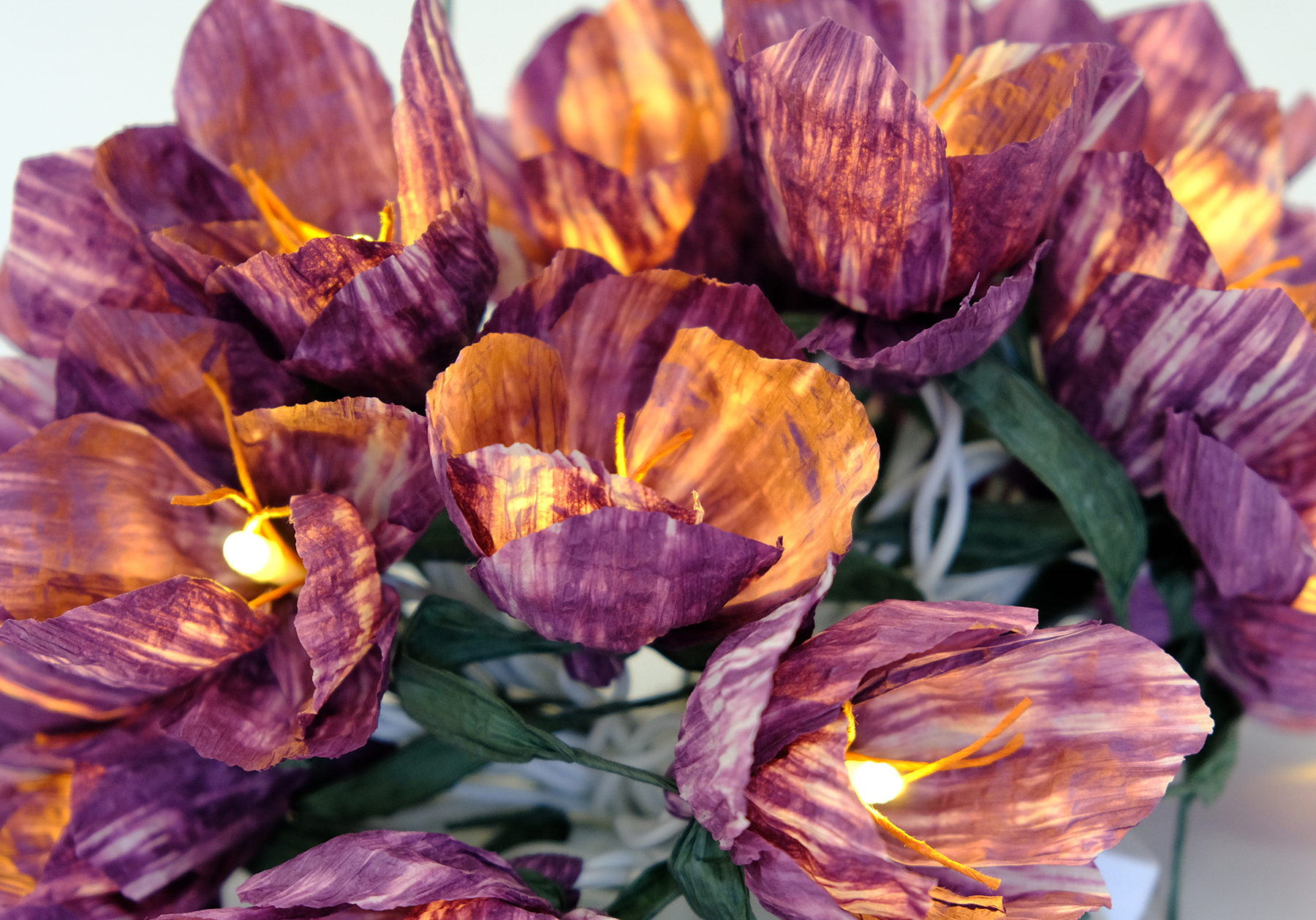 Schön leuchten sie, die handgemachten Blumen-Lichterketten aus den Tagesstätten Bern. Die Ketten bestehen aus Seidenpapier. Jede Blume wird sorgfältig hergestellt. Ein schönes Accessoire für den Wohn- und Schlafbereich. Die LED-Lichter strahlen in warmem Licht.