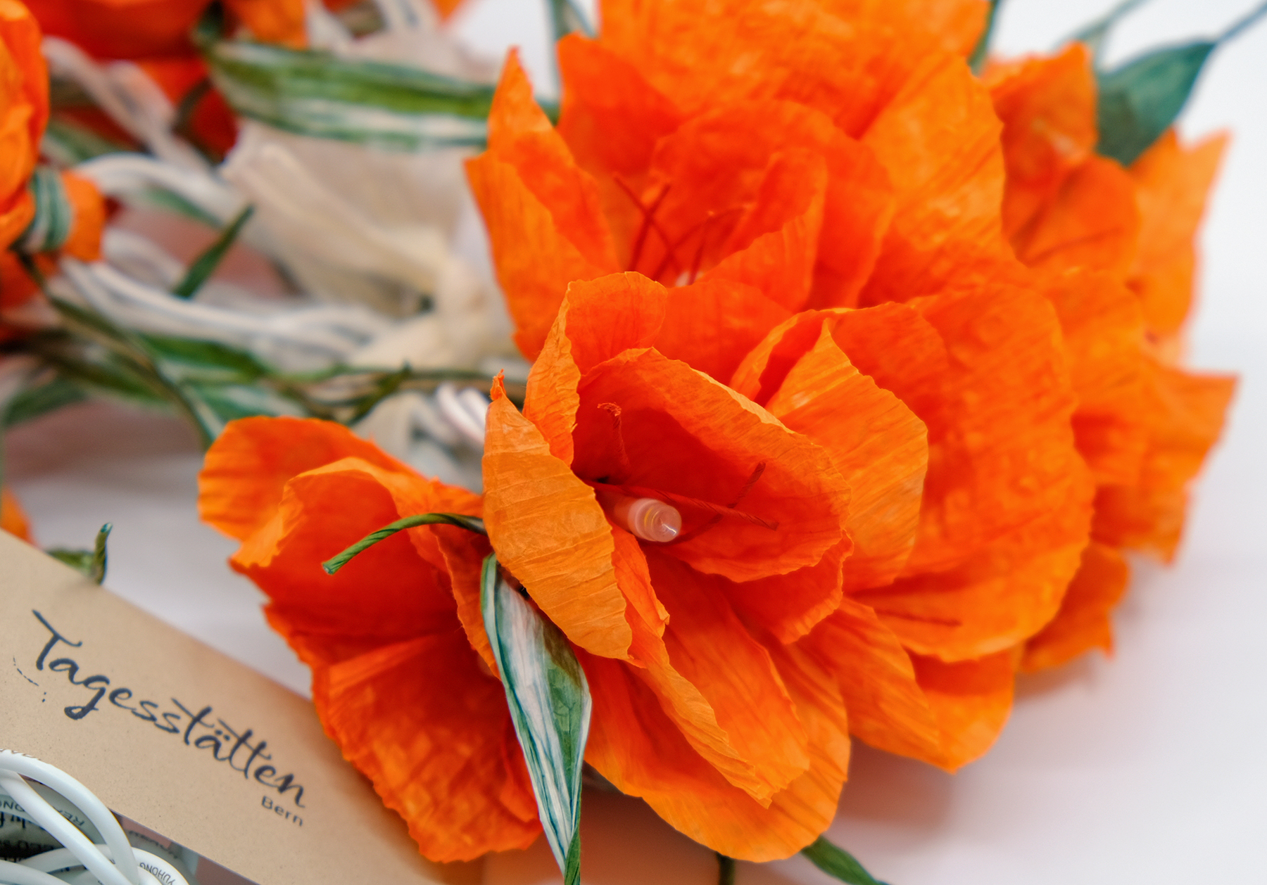 Schön leuchten sie, die handgemachten Blumen-Lichterketten aus den Tagesstätten Bern. Die Ketten bestehen aus Seidenpapier. Jede Blume wird sorgfältig hergestellt. Ein schönes Accessoire für den Wohn- und Schlafbereich. Die LED-Lichter strahlen in warmem Licht.