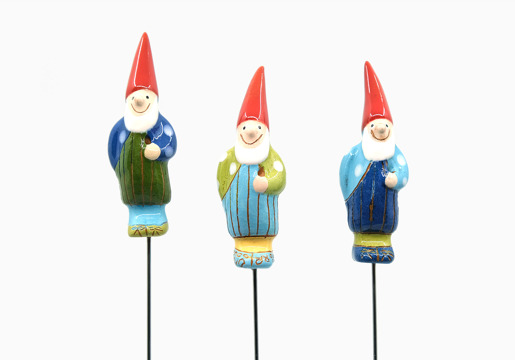 Die Gartenzwerge werden von Hand geformt und bemalt. Die Porzellanfiguren haben – zum Hineinstecken von Blümchen, Schirmchen und Ästchen – ein kleines Loch beim linken Arm. Die Farbauswahl bezieht sich auf die Oberteile. Mützen bleiben rot, die restlichen Kleidungsstücke können in der Farbe variieren.