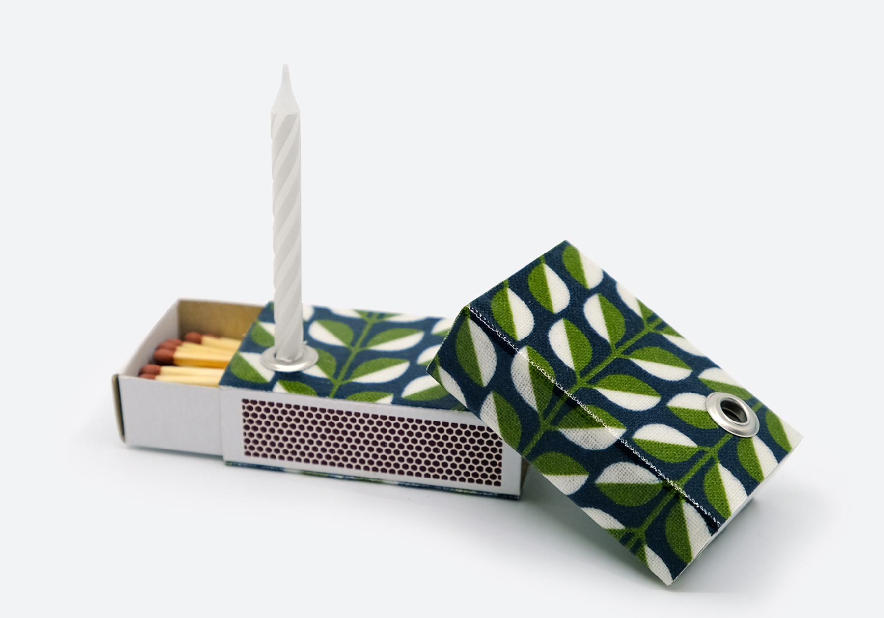 Wachstuch (Ausschnitte variieren), Zündholzschachtel mit Zündhölzern (CH Holz), Mini-Wachskerze